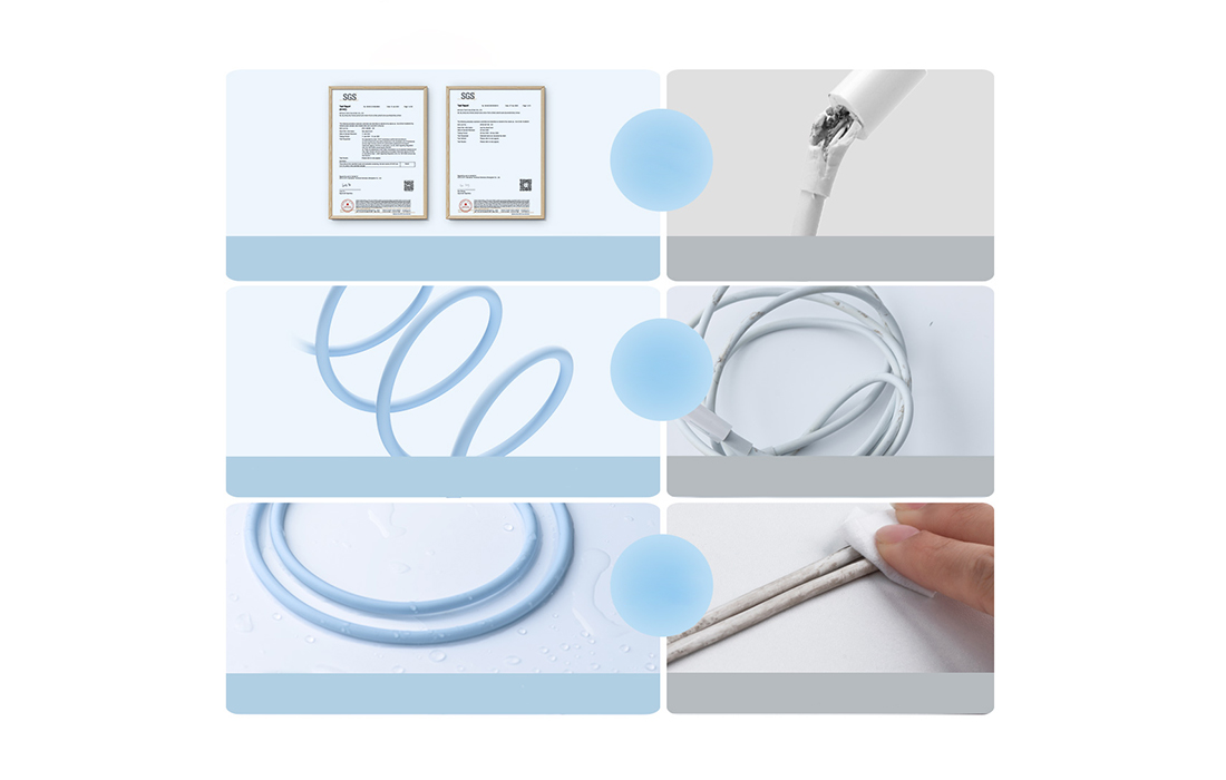 Kabel je zaštićen izdržljivim silikonom, što ga čini mnogo sigurnijim za upotrebu od redovitog gumenog kabela. Dodatna oprema je SGS certificirana, neće se zapetljati ili slomiti i otporan je na mrlje. Svatko tko je posjedovao gumeni kabel odmah će primijetiti veliku razliku.